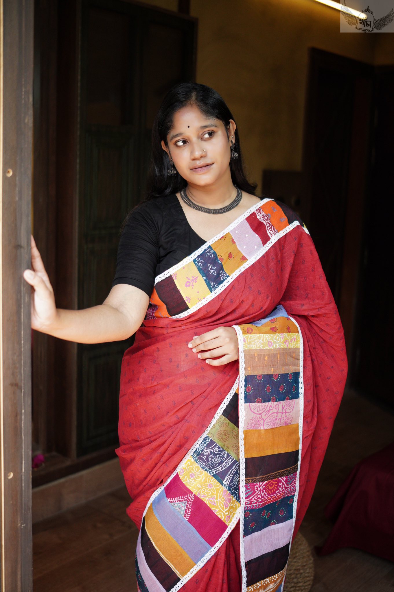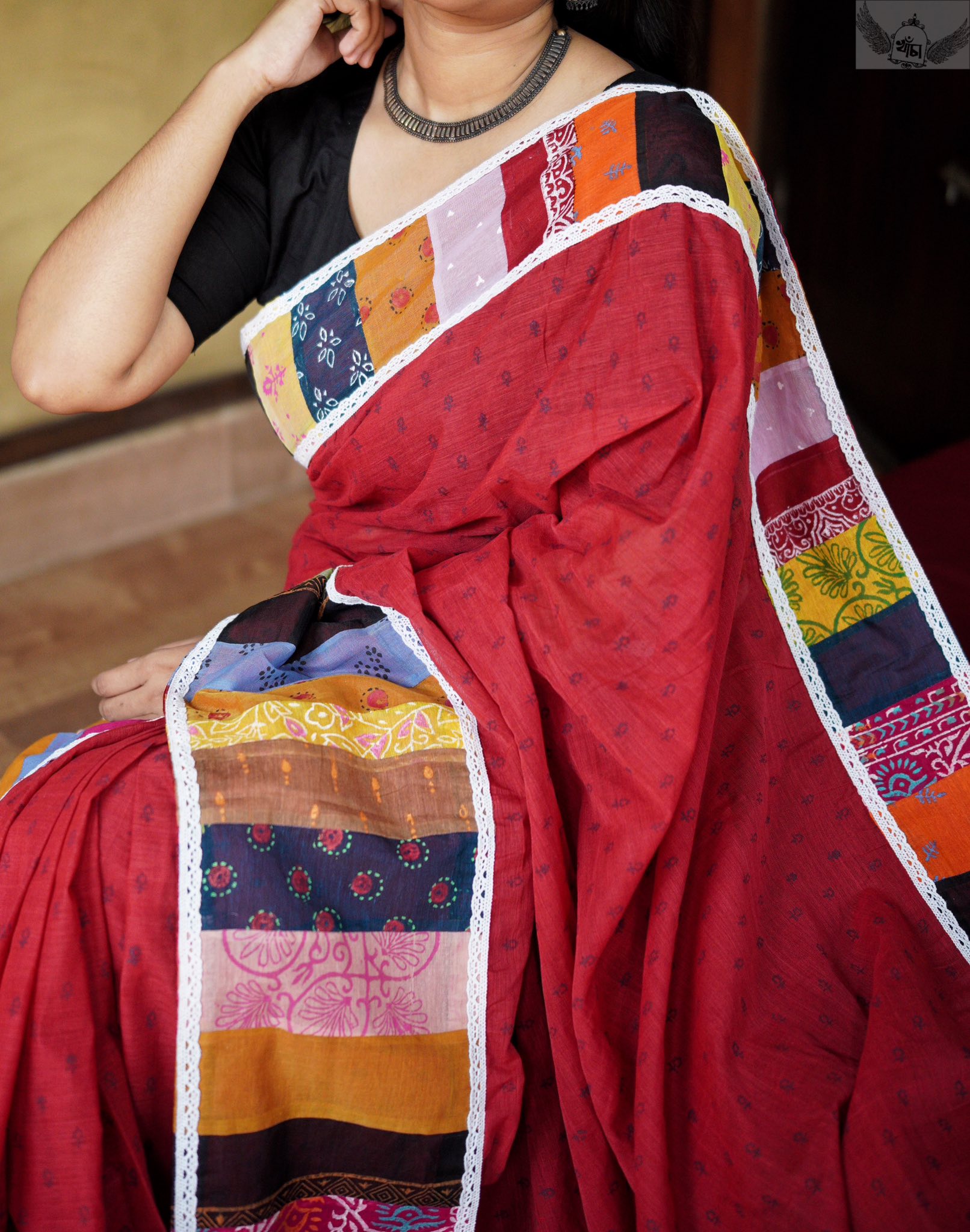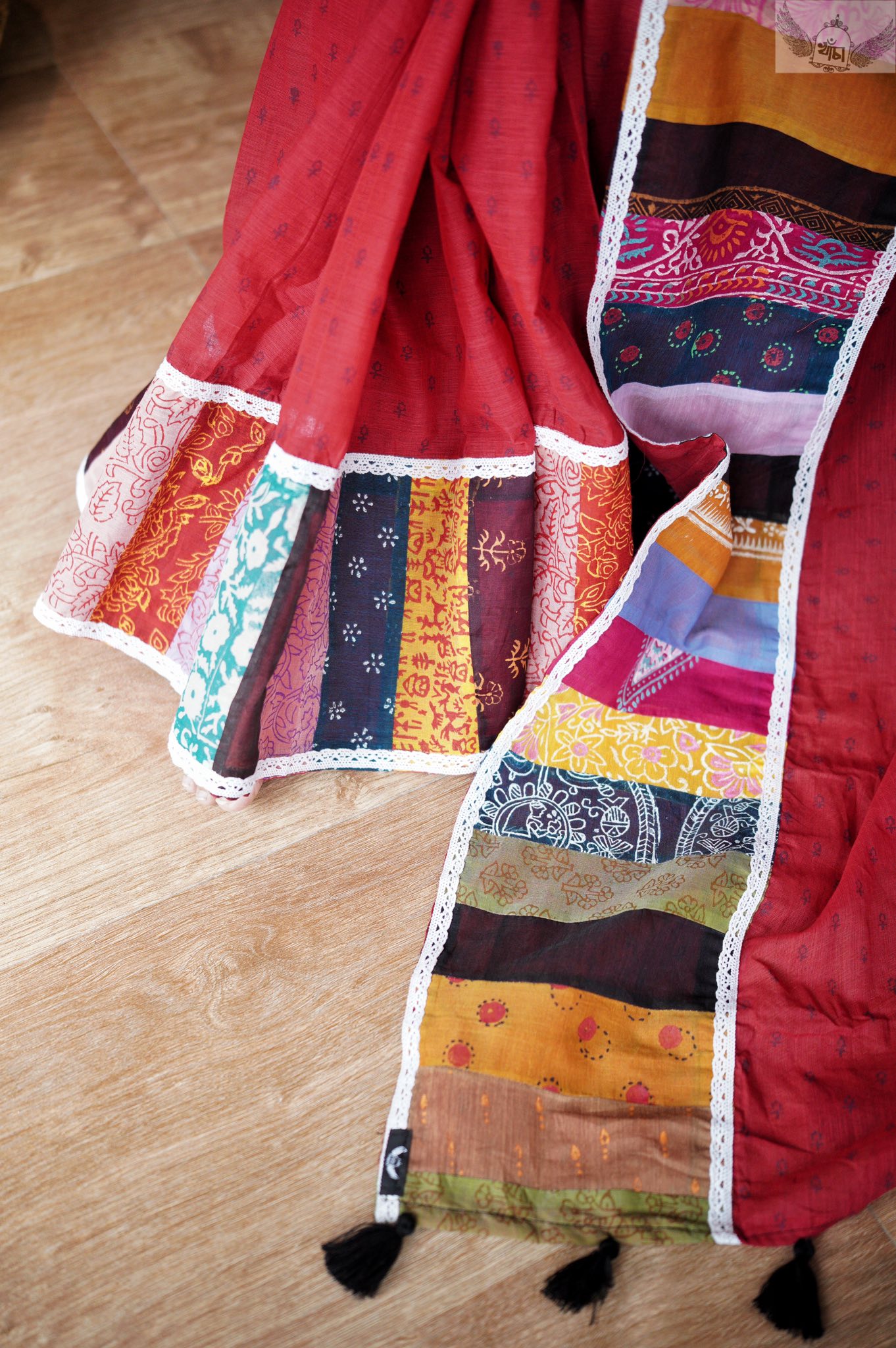 মিডিয়া: ব্লক প্রিন্ট, পারে লেইস ও প্যাঁচ ওয়ার্ক বসানো হয়েছে।
